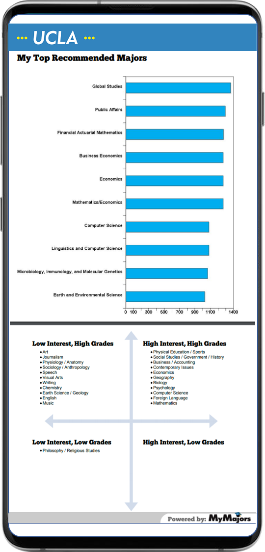 You have course and GPA requirements to enter your institution and for students to complete their degree. MyMajors evaluates these components to find programs that students can complete. The algorithm measures academic achievement (courses, grades, GPA, interest in specific courses), interest and work preferences. Other tests that only measure personality or interests only tell one side of the story.