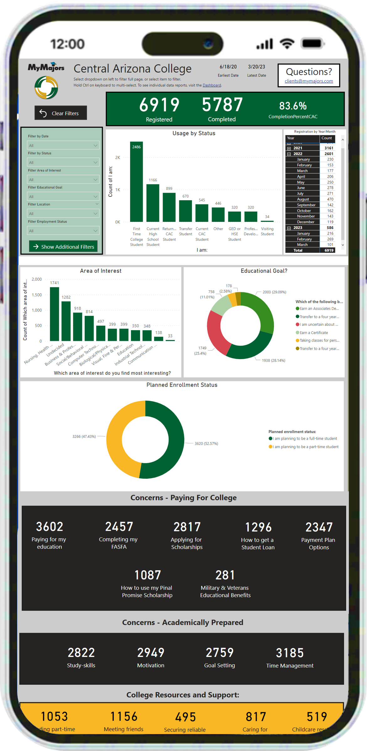 Students can now explore and affirm programs on your campus. Proactive data collection identifies key student concerns, goals, and interests. Overall aggregate data is provided for leadership with data on student responses (top concerns for first-generation students, major confidence, etc.).