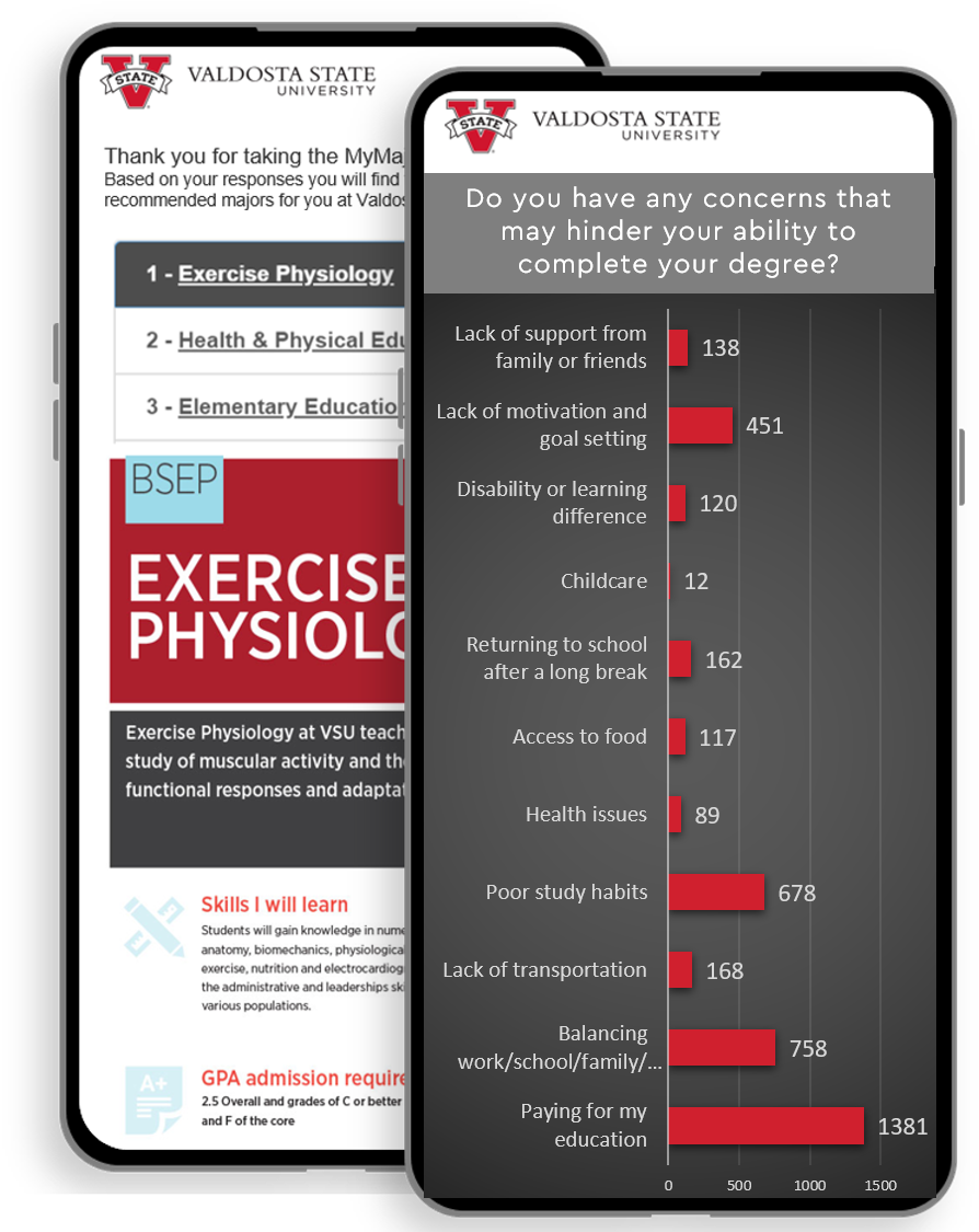 Client result: VSU was able to decrease their exploratory students entering the university by 55% by having new students take MyMajors before visiting with an advisor.