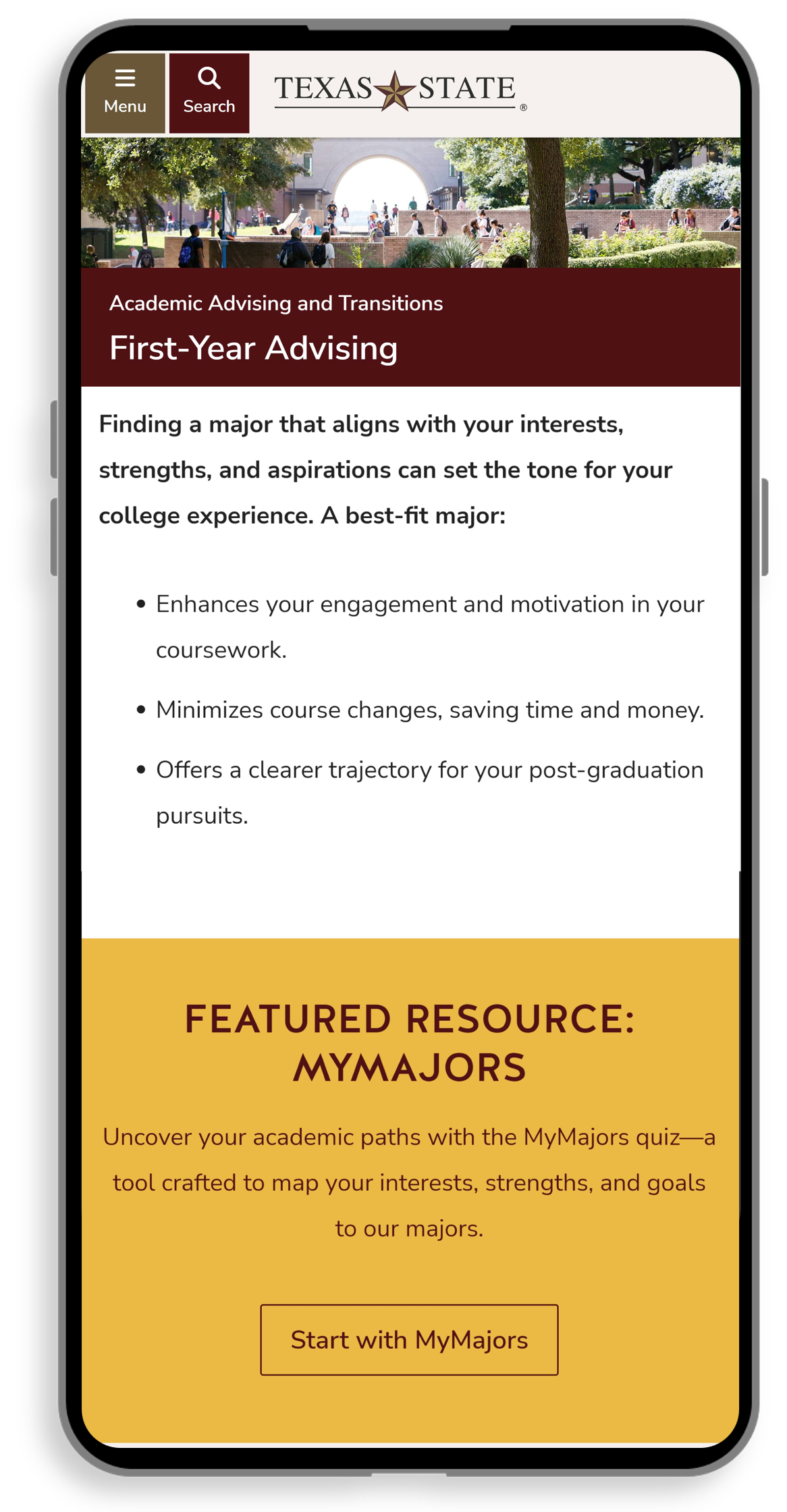 "MyMajors often introduces new options which encourages the student to explore new areas that they may never have considered or even knew existed. Students find MyMajors easy to use and highly accurate, and their advisors rely on the results to guide their students through the most important decision they will make in college."