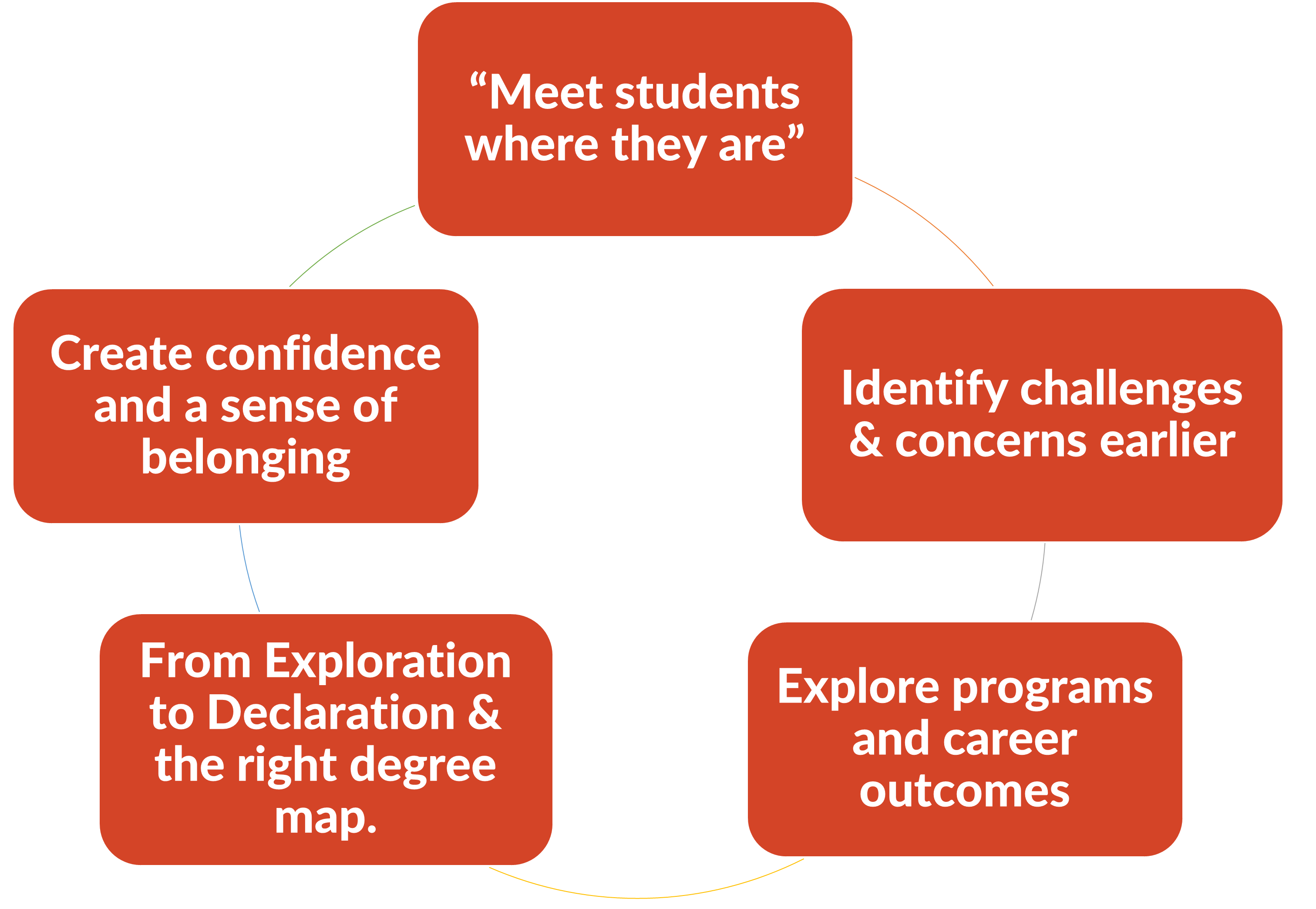 Early exploration and affirmation can decrease bottlenecks, major changes, and student dissatisfaction in their courses. All students (undeclared, declared, and returning adults) should be provided with a Purpose First experience.