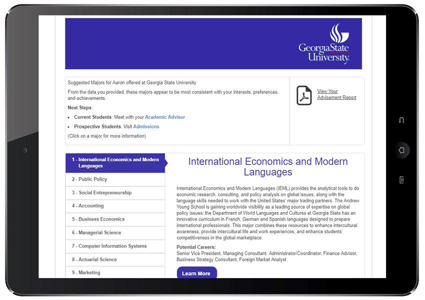 National Science Foundation backed program that recommends your custom majors in ranked order. Helping your prospective and current students create a plan on campus and work with faculty and staff to improve retention and graduation rates.